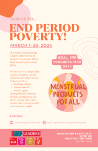 Service Interns, teens Suad and Maelie fight against period poverty through education and through the distribution of biodegradable organic period products to girls and young women in need. Each week during Women’s History month, we will share facts, and provide information, as we distribute products to those in need. Special thanks to MILA HYGIENE for providing the products at a discounted rate and for providing needed volunteers!